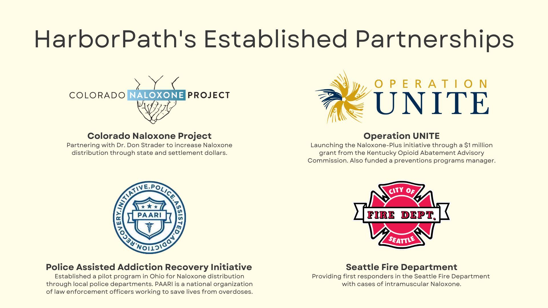 The opioid epidemic and the alarming rise in fentanyl poisoning cases require a comprehensive and united response. HarborPath's partnerships with organizations such as the Colorado Naloxone Project, Operation UNITE, Seattle Fire Department and PAARI exemplify the transformative impact that collaborative efforts can have in addressing the crisis. By teaming up with organizations that possess specialized knowledge and local expertise, HarborPath effectively tailors its strategies and interventions to the unique needs of each state or community.